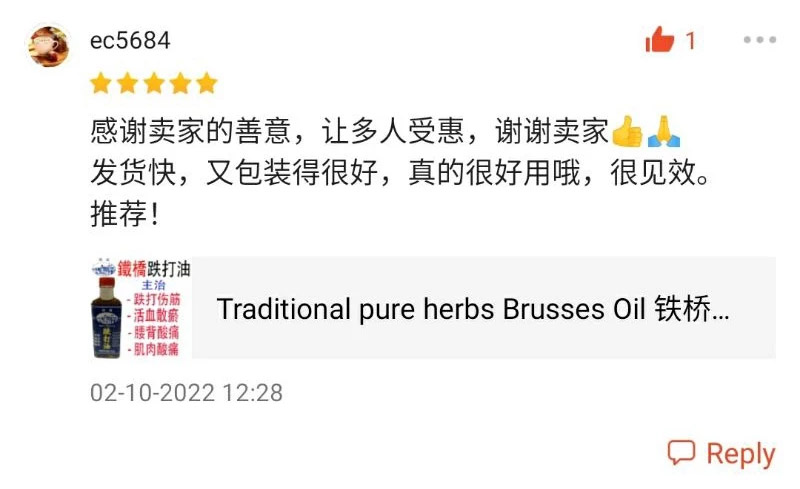 lron Bridge BRUISE OIL is a long standing traditional Chinese herbal preparation. with unique medicinal properties and gentle nature. It has become a staple in many households. When the body experinces bruises or sprains, applying Iron Bridge Bruise oil externally can effectively relieve discomfort and promote faster recovery.